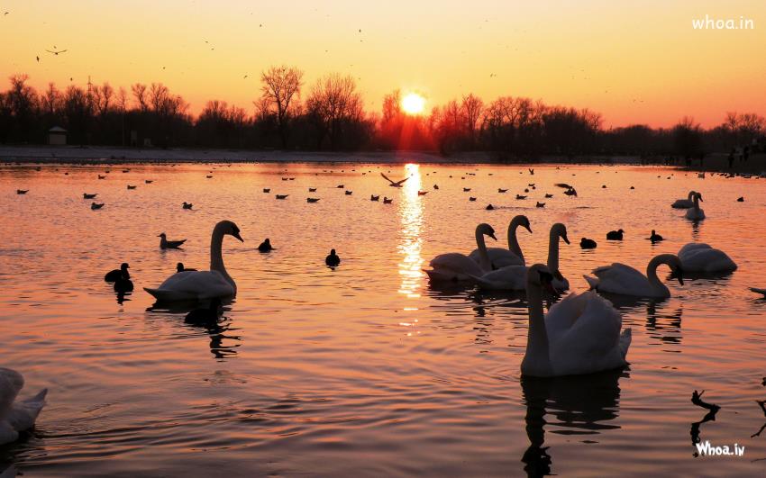 Natural and Amazing Sunset with White Swan HD Wallpaper