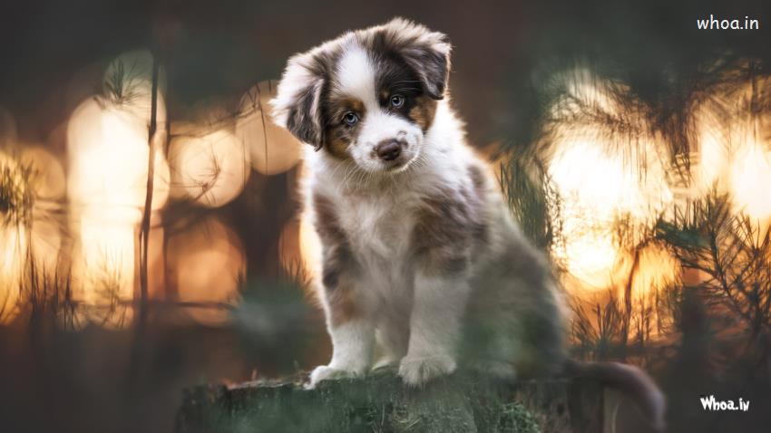 Puppy Dog Is Sitting On Wood Trunk In Blur Bokeh BackAustralian Shepherd Puppy Dog Is Sitting On Wood Trunk In Blur Bokeh Background HD Dog Wallpaper