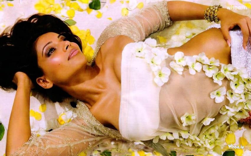 Bipasha Basu Laying On A Bed With Flowres Hot HD Wallpaper