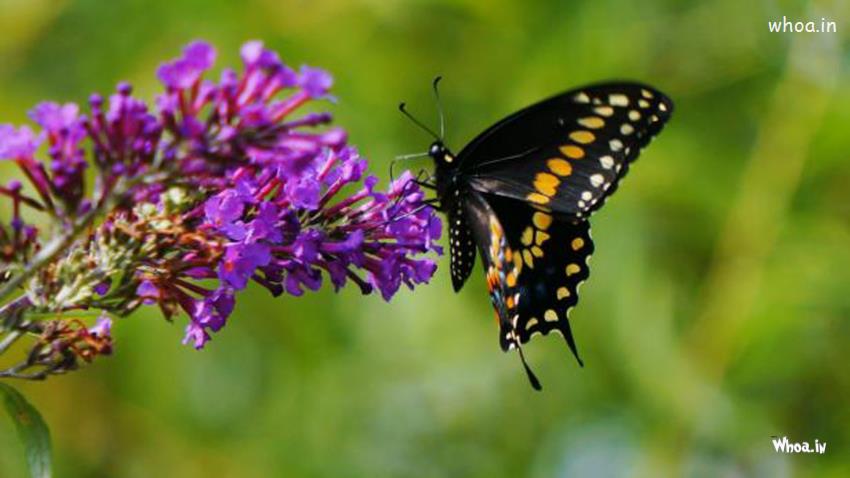 Black yellow dots design butterfly on purple flowers in blur green background Download - Most Downloaded Wallpapers