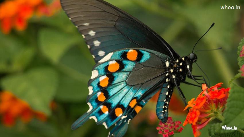 Blue Black Yellow Dots Design Butterfly On Red Flower In Green Background HD Butterfly Wallpaper - Wallpapers tagged with BUTTERFLY