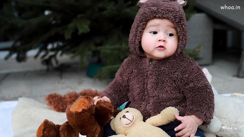 Cute Baby Pictures [HD] | Download Free Images For Facebook Cover - Cute Baby Wearing Brown Woolen Knitted Dress Sitting With Toy Wallpaper