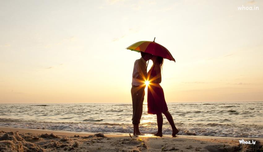 Download the wallpaper and image of a kissing couple at Beach area on sunset time