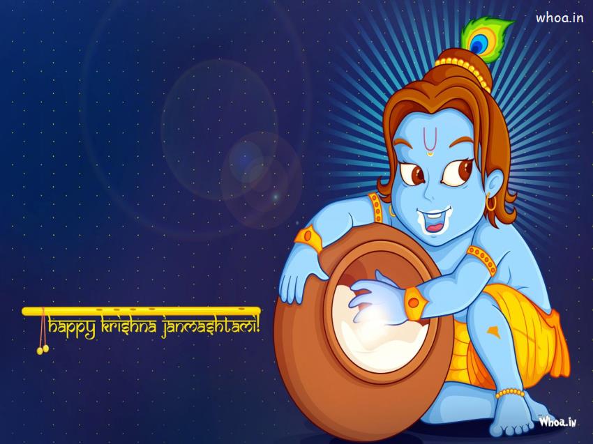 Cute Lord Bal Kirshana Happy Janmashtami wallpaper with makhan