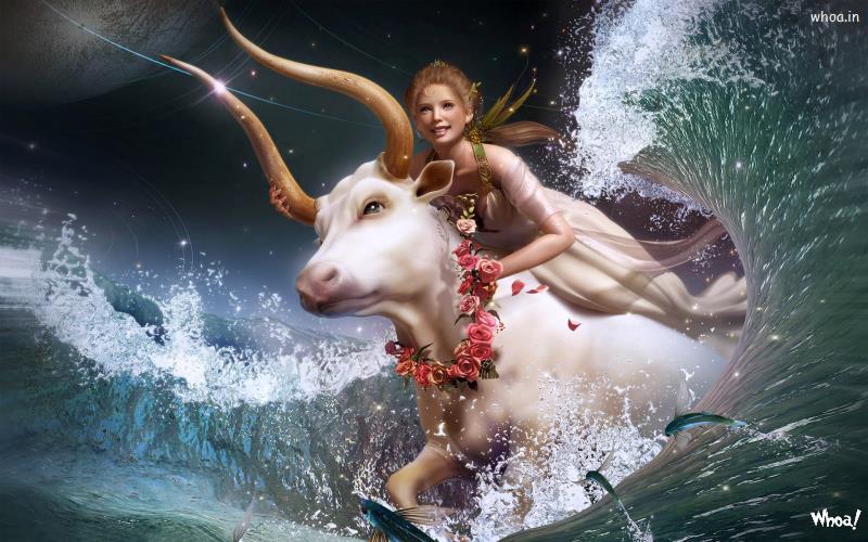 Fantastic Dreamy girl Ride On a white Bullock Into the Water Hd Wallpaper For Desktop Background