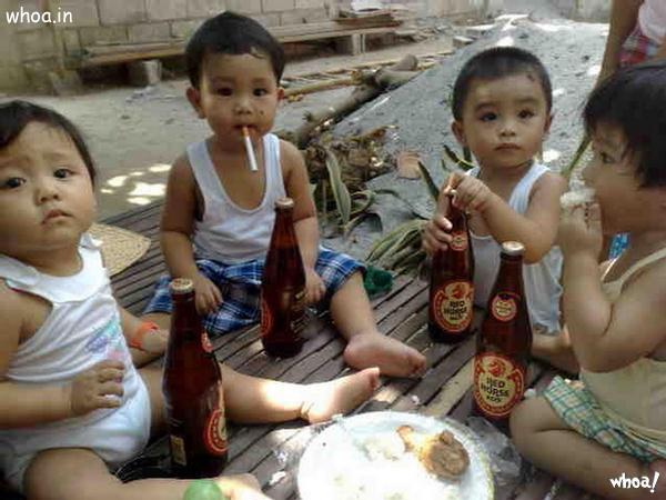 funny photo of childs have a smoke and drunk