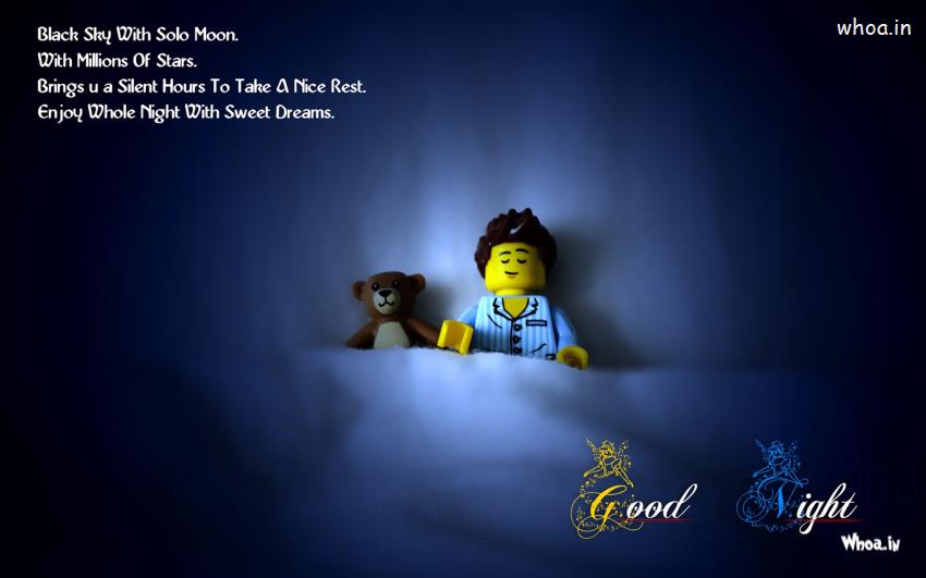 Good Night With Sleeping Toys with Quote Like Black Sky with Solo Moon,with Millions of Stars,Brings u a Silent Hours to Take a Nice Rest.