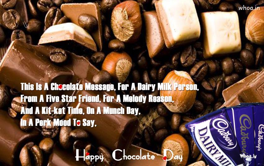 This Is A Chocolate Message, For A Dairy Milk Person, From A Five Star Friend, For A Melody Reason, And A Kit-kat Time, On A Munch Day, In A Perk Mood To Say, Happy Chocolate Day.., happy chocolate day celebrated with different chocolate nut, Happy Chocolate Day Greetings Cards, Quotes And Hd Wallpaper For Free Download