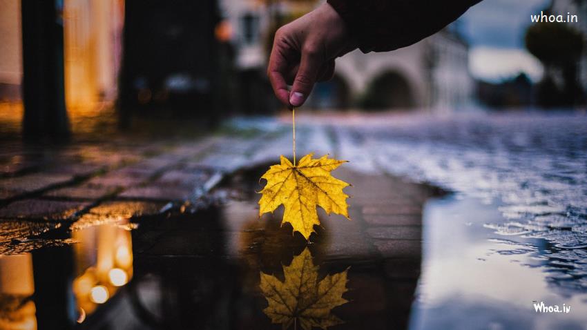 Man Is Holding Yellow Autumn Leaf Reflection On Water Photography Hd Photography