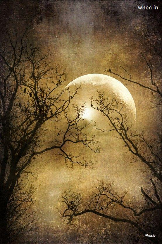 natural moon hand painting with tree and birds, Moon Photoshoot, Moon Photoshoot Art, Moon Wallpapers For Mobile For Free Download