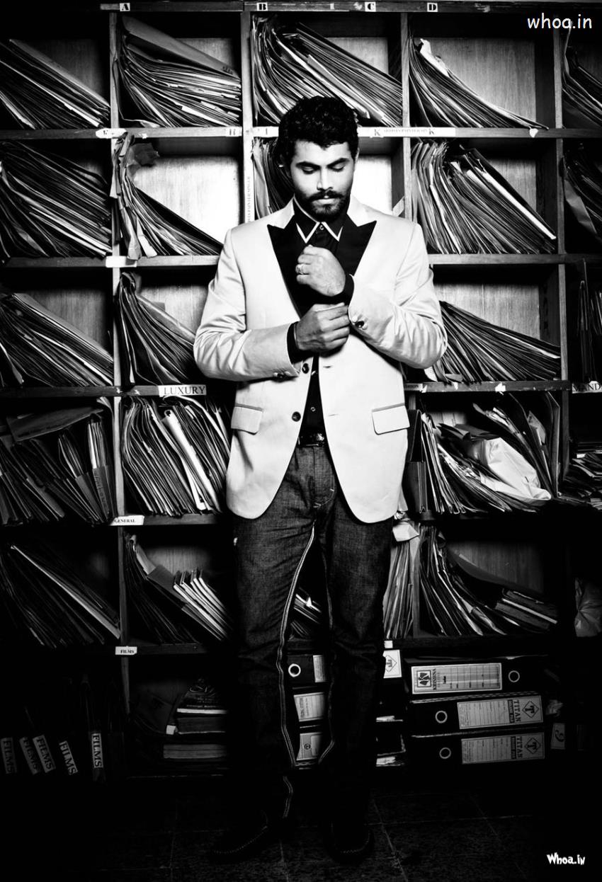 Sir Ravindra Jadeja Modelling photo shoot with white coat with cool beard style, Black white wallpaper of sir jadeja