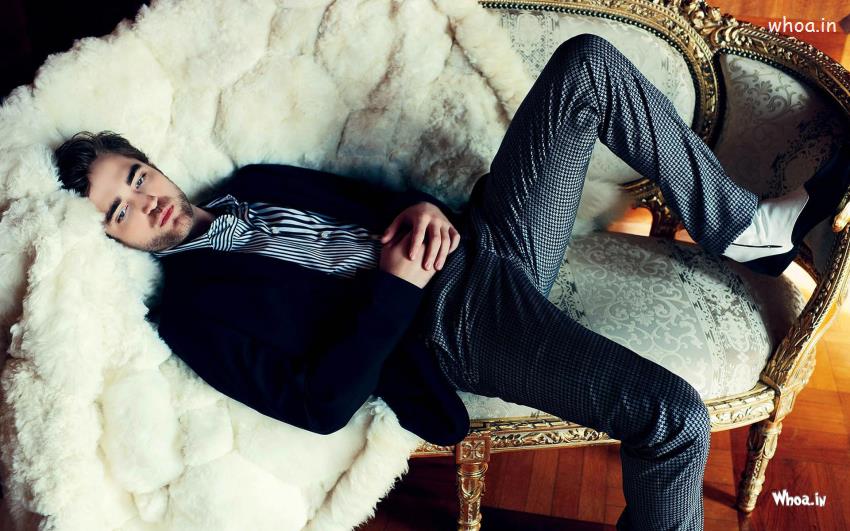 Robert Pattinson Blue Suit and Laying on Chair Widescreen HD Wallpaper, Hollywood Actor Images