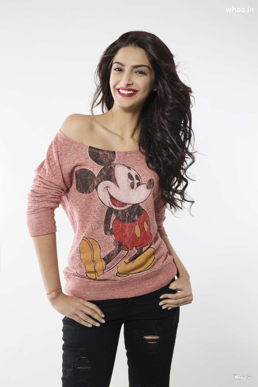 Sonam Kapoor wear Mick Mouse T-shirt with Naughty Smile HD Image,Sonam Kapoor Image,Bollywood Actress Wallpaper,Indian Celebrity Wallpaper