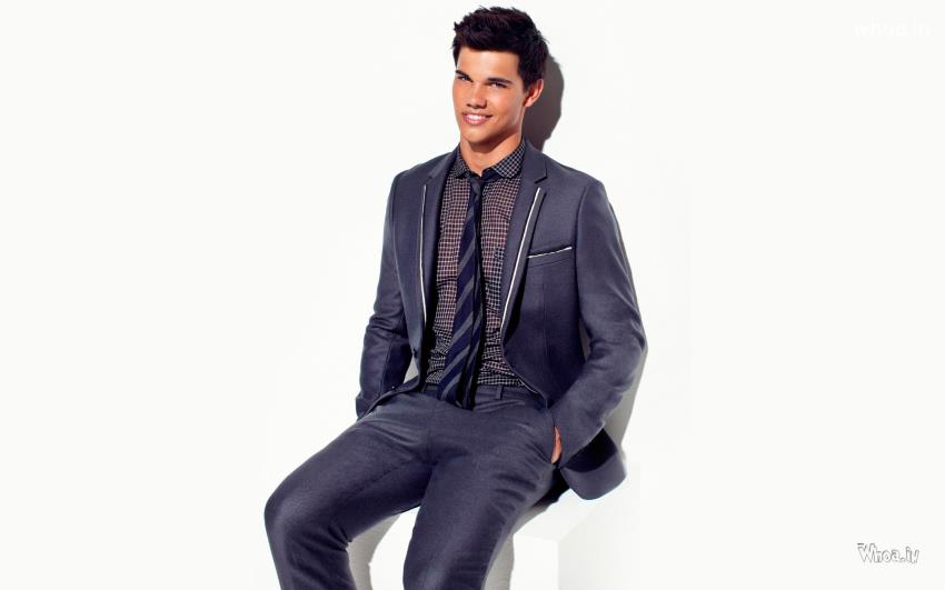 Taylor Lautner Blue Suit and Setting on White Chair HD Desktop Wallpaper, Hollywood Actor Images, Taylor Lautner Image, The Twilight Actor