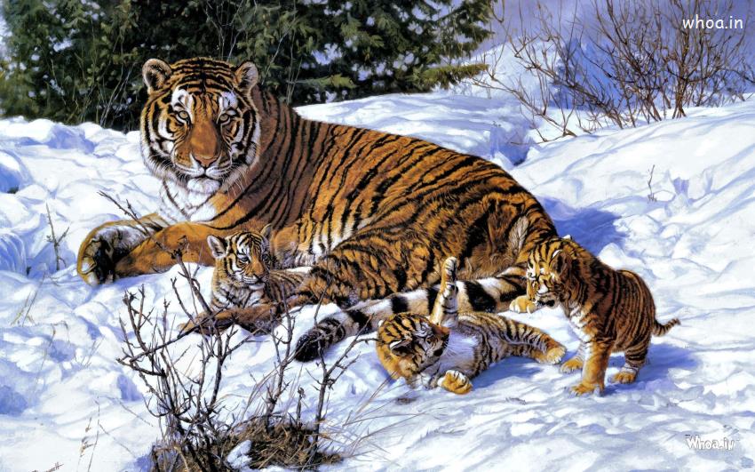 Tiger with His Cubs in Winter Wallpaper, Images of Tigers Cubs, Tigers Cubs Playing in Snow Wallpapers